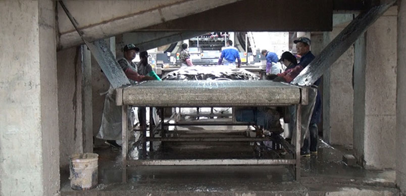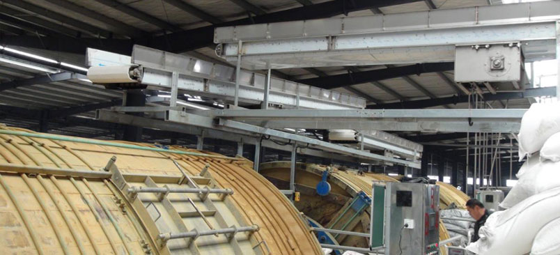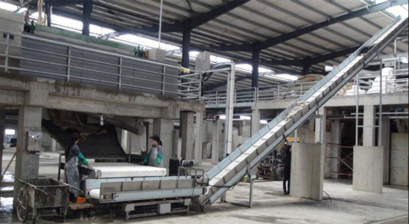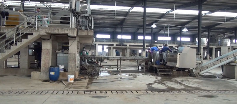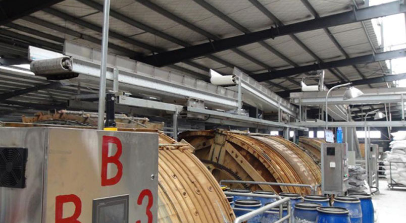 三、入鼓膨脹和肉渣輸送線 去肉后的皮張自動滑落至膨脹入鼓線上 (由于各制革廠工藝的不同,有些制革廠在此再加一個自動輸送平臺用于修邊),輸送線自動完成計重后送入到指定轉(zhuǎn)鼓浸灰膨脹;從皮張上刮下來的肉渣由肉渣輸送線送至肉渣壓水機(jī)。