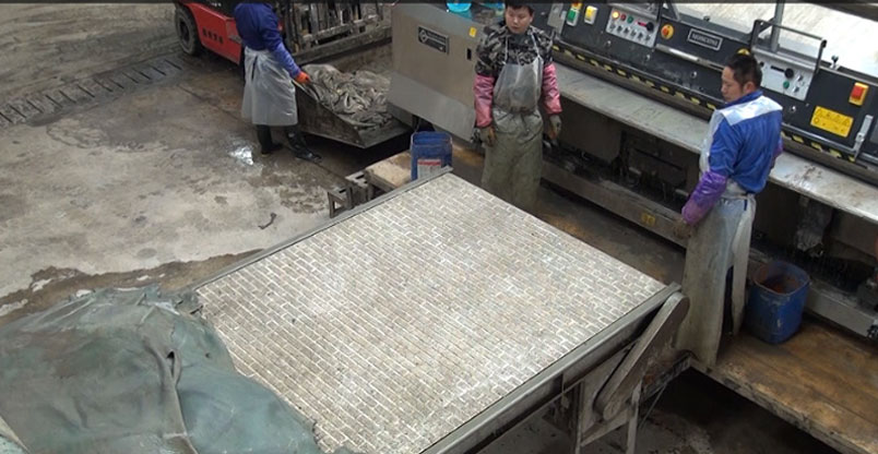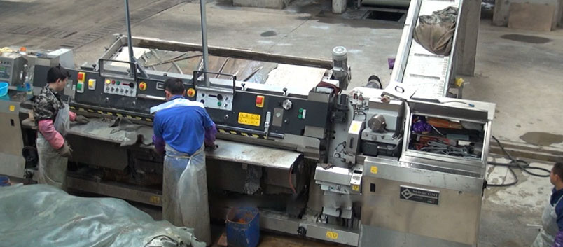 五、輸送平臺 灰皮去肉后自動掉落到輸送平臺上,操作工完成對皮張的修邊和碼皮,碼整齊的灰皮被輸送至剖層機(jī)的工作臺前,操作工進(jìn)行剖層皮革。
