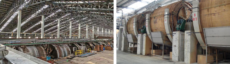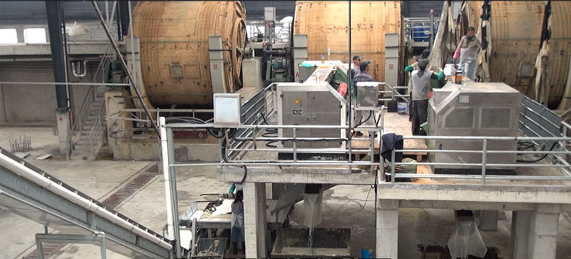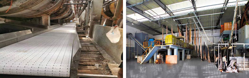 六、入鼓鞣制線 完成剖層后的頭層皮由自動拉皮裝置從剖層機(jī)拉出掉落至鞣制入鼓線上,輸送線對皮張自動計重并送往指定的轉(zhuǎn)鼓進(jìn)行鞣制,到達(dá)指定重量后轉(zhuǎn)鼓鼓門關(guān)閉,輸送帶按設(shè)定的程序?qū)⑵ぽ斔椭疗渌D(zhuǎn)鼓。